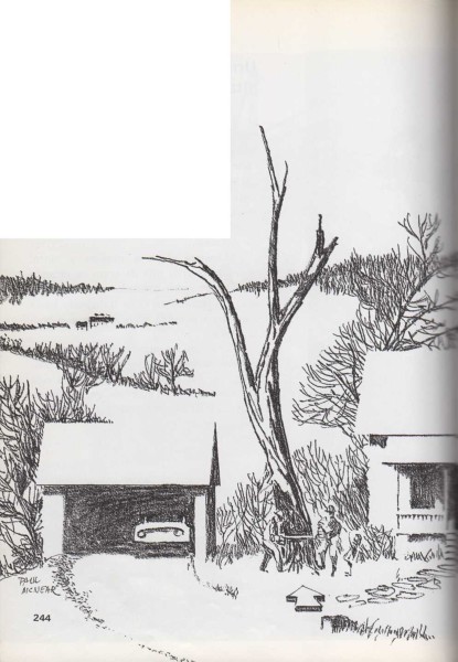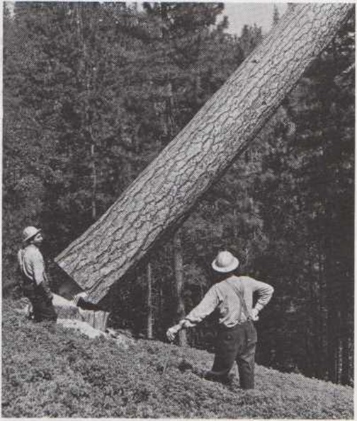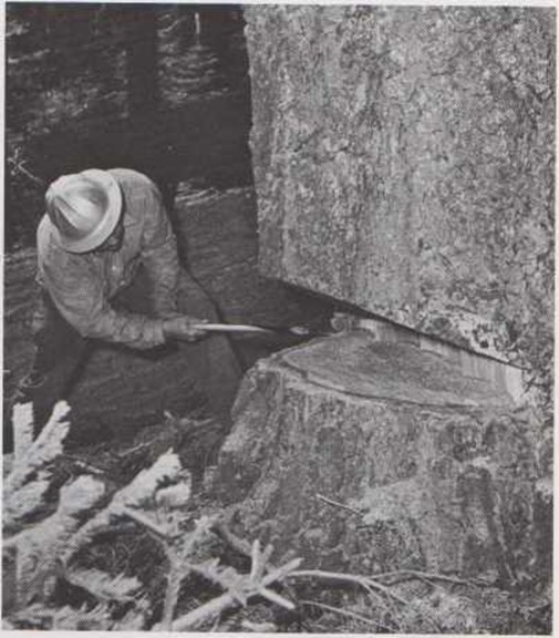 Imagínate que tienes que cortar el árbol que ves en este dibujo. Si cae a la derecha aplastará la casa. Si cae a la izquierda destruirá el garaje. Si cae hacia delante cortará la carretera. La única dirección en que el árbol puede caer sin peligro es en la que señala Pero, ¿cómo lograr que el árbol caiga en esa dirección? Se abre un corte en forma de V en el lado del tronco por donde se quiere que el árbol caiga. Entonces se sierra el árbol por el otro lado y a la misma altura. El trozo en forma de V que falta, hace que el árbol pierda el equilibrio. Y, con un enorme ruido, el árbol cae al suelo en la dirección que señala la flecha. |