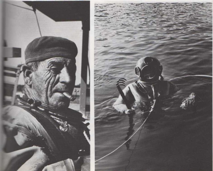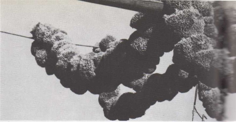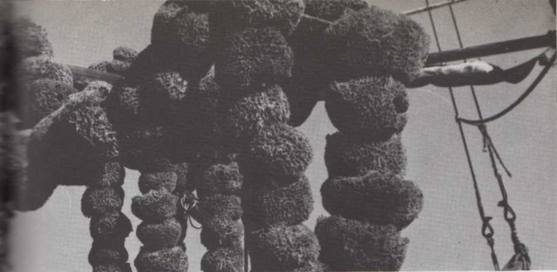 Las esponjas son animales que viven en el fondo del mar. Cuando los pescadores las buscan en fondos poco profundos, que es donde suelen estar las esponjas, navegan en una barca que tiene el fondo de cristal. El pescador se sienta y observa el mar en busca de ellas. Cuando ve una, mete en el agua un largo palo rematado por un gancho, lo clava en ella y saca la esponja. Para recoger esponjas en mares más profundos, los pescadores utilizan escafandra y vestidos de buzo. Se sumergen en las profundidades y caminan por el fondo del mar, donde cogen esponjas y las depositan en un cesto que está en el agua colgado de la barca. Los hombres de la barca izan el cesto y ponen las esponjas a secar al sol. Cuando ya han recogido bastantes, los buzos son subidos al bote y la barca regresa a puerto.