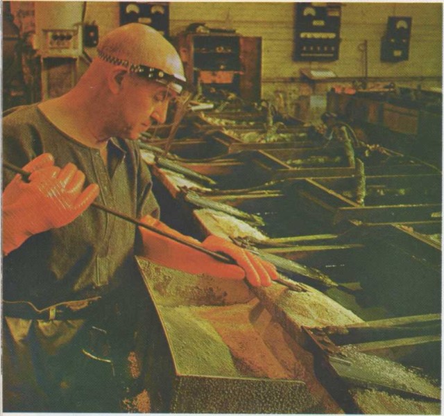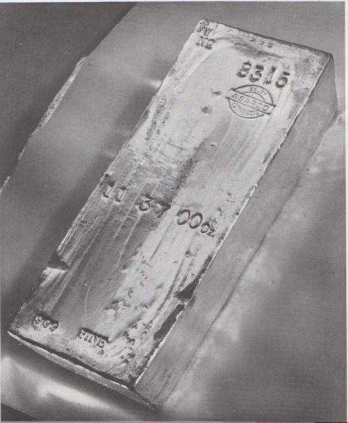 Los mineros sacan del suelo rocas que llevan estrías de plata. Pero esta plata no es pura hasta que no se ha separado de la roca. He aquí cómo se separa una de otra. Primero, algunos operarios introducen los fragmentos de roca que llevan plata en un homo encendido. Por unas aberturas especiales del fondo de ese homo entran ráfagas de aire caliente que avivan el fuego y aumentan la temperatura hasta que las rocas y la plata comienzan a fundirse. Pero la plata fundida pesa más que la roca fundida, por lo que aquélla se deposita en el fondo del homo. De aquí se recoge y es vertida en moldes, en los que se enfría y adquiere la forma de lingote. |