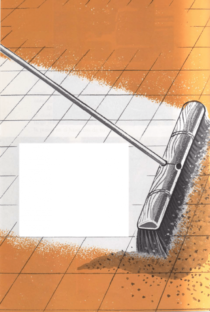 Cuando se procede a la limpieza de locales muy grandes, como la escuela o un aeropuerto, te puede parecer que lo hacen al revés de cómo debiera hacerse, porque comienzan arrojando serrín mojado en el suelo. Pero los empleados de la limpieza saben bien lo que hacen. El polvo y la suciedad del suelo se adhieren al serrín mojado; después, con la escoba se barre el serrín. Ello evita que se levante polvo. Además, los empleados pueden ver en qué sitios ya se ha barrido, porque la escoba deja un rastro que se advierte fácilmente.