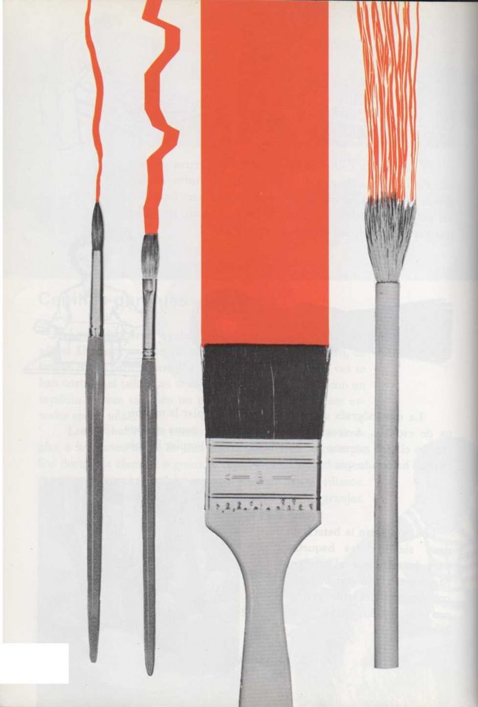 Los artistas que pintan cuadros usan pinceles de distintos tipos y medidas. Pinceles puntiagudos, pinceles de cerdas, pinceles pequeños, pinceles delgados, pinceles gruesos como brochas. Con el pincel indicado, el artista puede trazar líneas finas, pintar grandes manchas de color o representar todas las formas que pueda imaginar. Para algunos usos se emplea un pincel que no tiene pelos. Se le llama pincel de aire comprimido. Cuando se pinta una casa se emplean también muchos tipos de pinceles. Para las grandes superficies, se utilizan pinceles anchos y gruesos, brochas, que se hacen pasar una y otra vez sobre la superficie que se está pintando. Para los zócalos o la madera y las puertas, se emplean pinceles más pequeños. Para anuncios y carteles se usan pinceles especiales, con los que se pueden pintar letras más grandes que tú o más pequeñas que tu meñique. |
