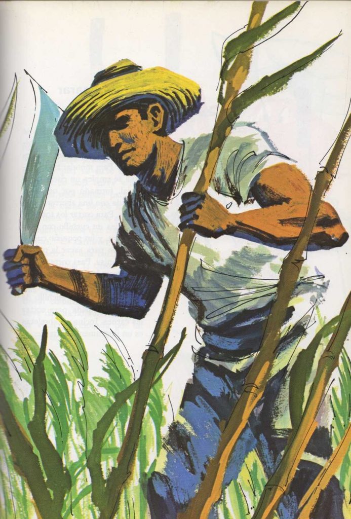 Algunos alimentos crecen en los árboles, otros en el suelo. Cuando ciertos frutos maduran, se cortan con cuchillos de varios tipos. El cuchillo que utilizan los cortadores de caña tiene una hoja larga y plana, con una punta curvada. Se llama machete. El trabajador corta los largos troncos de la caña con el ancho filo del machete y después los deshoja con la punta. En las islas tropicales se emplean grandes cuchillos para cortar los cocos de los árboles. Después, se rompe la cáscara con un hacha.