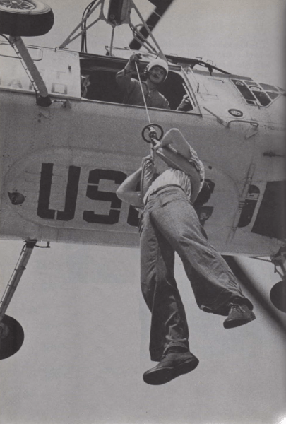 Los equipos de salvamento que disponen de helicóptero utilizan también cuerdas en sus operaciones de rescate. Cuando deben salvar a un hombre en el mar, el helicóptero vuela sobre él, como las abejas sobre las flores. Arrían una cuerda con un lazo al final, dentro del cual se pone la persona que deben rescatar. De este modo dicha persona puede ser izada del agua y transportada al helicóptero.