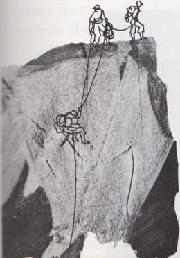 Los alpinistas corren el riesgo de caer en profundos precipicios o en las grietas de las montañas. Si un alpinista cae en un precipicio profundo y resbaladizo, del que no puede salir por sí solo, otros escaladores le arrojan una cuerda para izarlo con ella. Si ha resultado herido, un hombre descenderá por la cuerda para ayudarle.