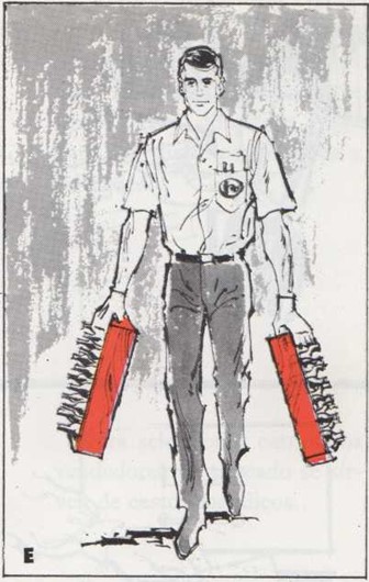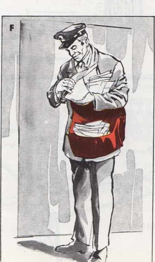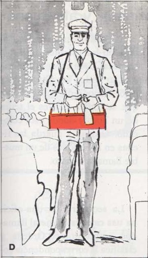 D. En los espectáculos públicos suelen venderse bebidas refrescantes. El vendedor lleva las botellas en una caja colgada de su cuello y ofrece su mercancía pasando lentamente por los pasillos centrales. E. El repartidor de bebidas espumosas o refrescantes transporta las botellas en cajas apiladas en un camión, las cuales reparte por bares o tiendas. F. El cartero lleva una gran cartera de cuero para repartir el correo.