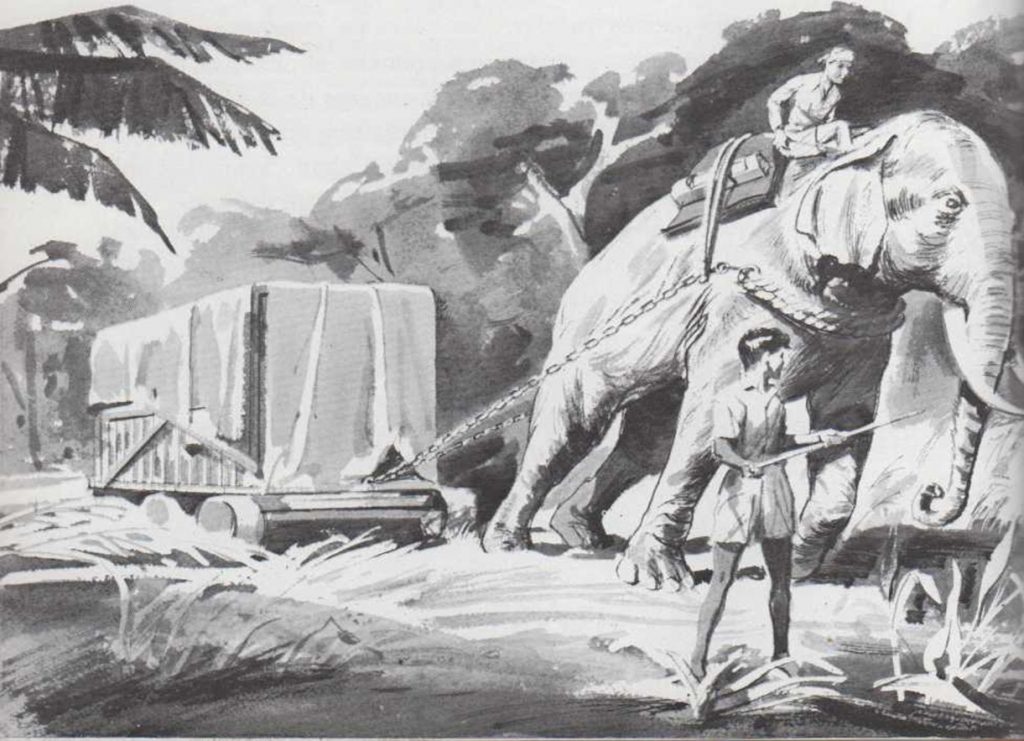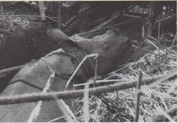 Para capturar rinocerontes, los cazadores excavan grandes agujeros en el suelo y los cubren con cañas, tallos, hierba y paja. Cuando un rinoceronte cae en un agujero, los cazadores lo atan con cuerdas y lo arrastran hasta una jaula. Después atan la jaula a un elefante y sacan al rinoceronte de la selva.