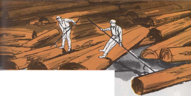 Los leñadores usan una pica para empujar o arrastrar los troncos que van descendiendo por el río hacia la aserradora.