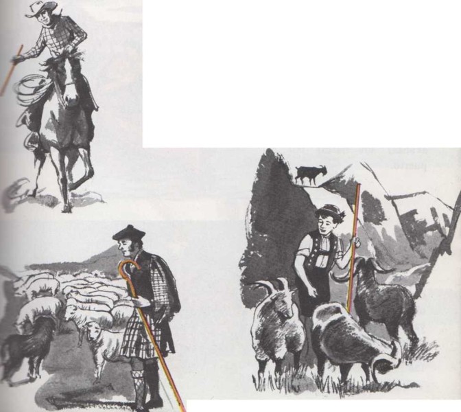 Los cowboys usan varas puntiagudas para hacer avanzar a las vacas. Los pastores, cuando conducen el ganado a los pastos, se sirven también de un tipo de bastón para conducir a los animales.