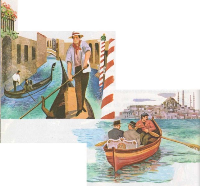 En Venecia, las calles son canales de agua. Y los taxis son barcas muy graciosas que se llaman góndolas. El gondolero hace avanzar su embarcación por medio de un largo remo, que mueve con mucha destreza