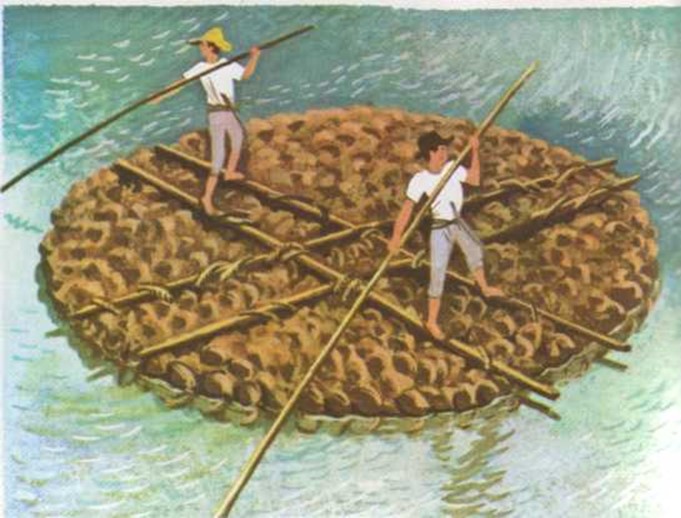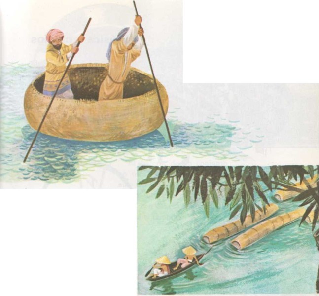 En las islas Filipinas, las balsas cargadas avanzan por el río hacia el mercado. Los hombres usan unos largos palos que apoyan en el fondo del río para impulsar la balsa.