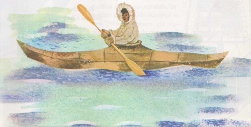 El esquimal, cuando va a cazar, usa remos de madera para hacer avanzar su kayak, hecho de piel de foca.