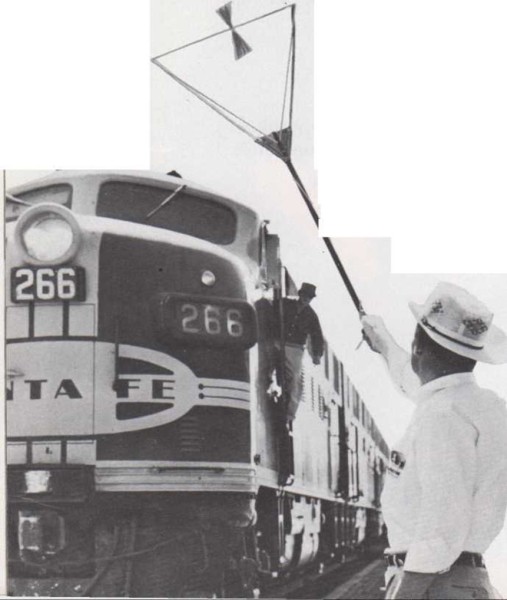 A veces, el jefe de estación tiene que entregar una nota al maquinista de un tren que se aproxima a gran velocidad. Ei jefe de estación no puede entregar la nota con la mano porque la cabina del maquinista está demasiado alta y el tren circula a mucha velocidad. Entonces, en el extremo de un largo palo ata la nota con una cuerda que forma un lazo. Cuando el tren pasa, el maquinista se asoma a la ventanilla y apunta su brazo hacia la cuerda. El lazo queda prendido en su brazo al desprenderse del palo.