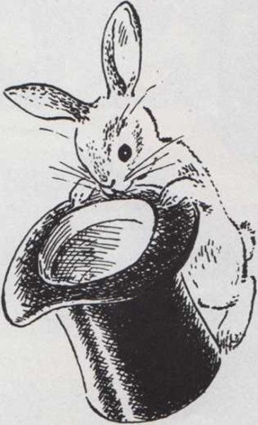 Los prestidigitadores usan un sombrero alto y negro, útil más para hacer sus trucos que para cubrirse la cabeza. Pueden verter agua o romper huevos en su interior. De pronto, los huevos y el agua desaparecen. Y cuando piensas que no hay nada en el sombrero, salta un conejo de su interior.