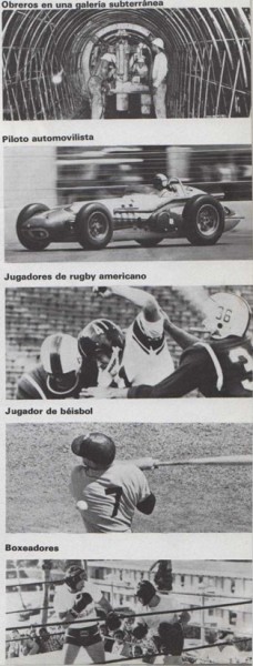 Y lo mismo hacen los operarios de la construcción de túneles o metros. Los pilotos de coches de carreras usan cascos para proteger su cabeza. Los jugadores de rugby americano se cubren la cabeza con un casco acolchado para protegerse de los golpes que podrían recibir durante el partido. Cuando el jugador de béisbol va a batear, se pone un resistente casco que le protege del posible golpe de la pelota. Los boxeadores también usan cascos protectores, pero sólo en los entrenamientos previos al combate. |