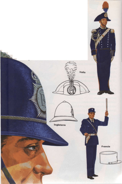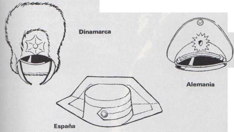 Los carabineros italianos llevan gorros negros con un penacho rojo en la parte superior. Los gorros de los gendarmes franceses son cilindricos, con visera. Los policías ingleses usan un casco azul oscuro. |