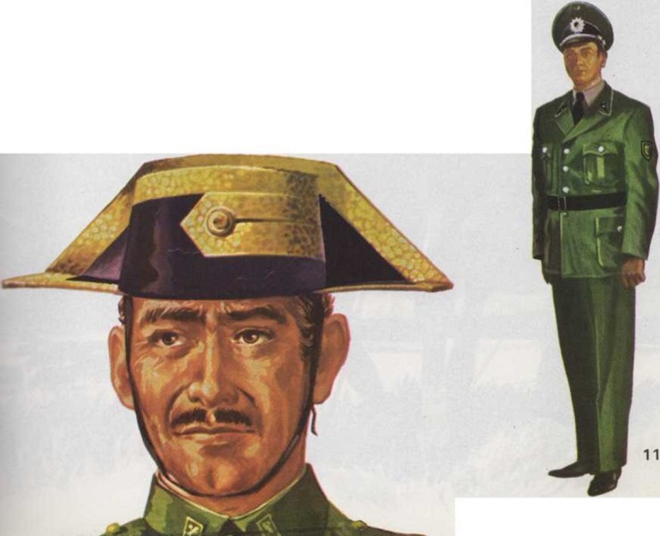 La guardia civil española lleva tricornio, que es un sombrero de tres puntas. Normalmente es negro, pero el que se usa en las ceremonias de gala está ribeteado con cintas bordadas con hilos de oro.