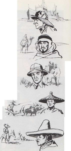 Los camelleros árabes se cubren la cabeza y el cuello con grandes pañuelos para protegerse del tórrido sol del desierto. Cuando el viento levanta en el aire nubes de arena, se envuelven la cara con el pañuelo para protegerse. En las tierras tropicales, el clima es caluroso y húmedo. Los cazadores, exploradores, policías y muchas otras personas usan un tipo de casco ligero que se llama salacot. En ciertos países, como Indonesia y Corea, los campesinos se cubren con sombreros de paja de forma cónica que protegen del sol. En México se usa un sombrero de ala muy ancha y redondeada. |