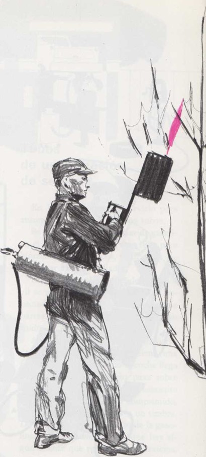 Cuando los bomberos llegan al lugar del incendio, conectan el extremo de una gruesa manguera a una boca de riego. Empalman después el otro extremo a una bomba del coche de bomberos. Otros bomberos conectan largas mangueras al coche. Abren los grifos y el agua sale de la boca de riego, pasa por la gruesa manguera, va a la bomba y de allí sale a presión por las largas mangueras. Los bomberos sostienen la manguera firmemente y dirigen el chorro de agua a la base de las llamas. Cuando el fuego ha sido extinguido, vuelven a colocar las mangueras en el coche. De vuelta al cuartel, las sacan, las extienden y las dejan secar. Los agricultores usan a veces un lanzallamas para eliminar insectos de los árboles y arbustos. Un tubo de goma conecta la válvula por donde sale la llama con un bidón de gasolina. El agricultor lleva este bidón a la espalda. Debe mover continuamente la llama para no quemar los árboles. |