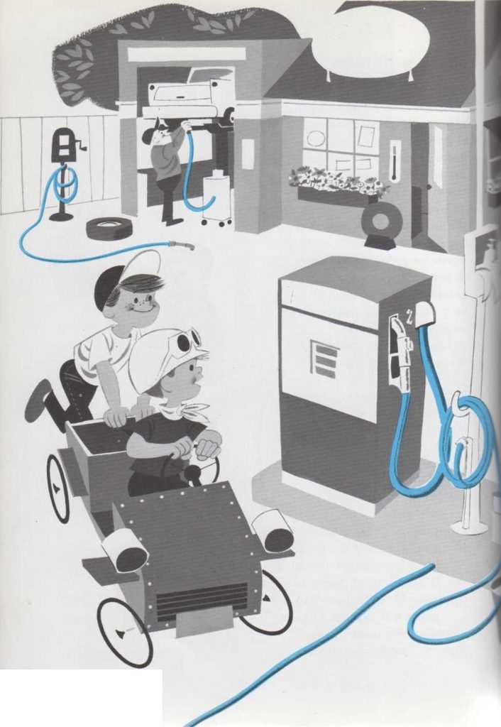 Se usa un tubo para llenar de gasolina el depósito del coche, otro tubo para hinchar los neumáticos, y otro para suministrar agua al radiador. Incluso para el engrase del automóvil se emplea a veces un tubo que, conectado a un depósito, lubrica algunas partes del coche para evitar que hagan ruido. Algunas estaciones están provistas de un tubo de goma que tiene una función especial. Cuando el coche llega a la estación de servicio pasa sobre este tubo colocado transversalmente en el suelo, el cual, al ser comprimido, hace sonar una campana o un timbre. De este modo, el empleado de la gasolinera queda advertido de que hay algún cliente que requiere sus servicios. |