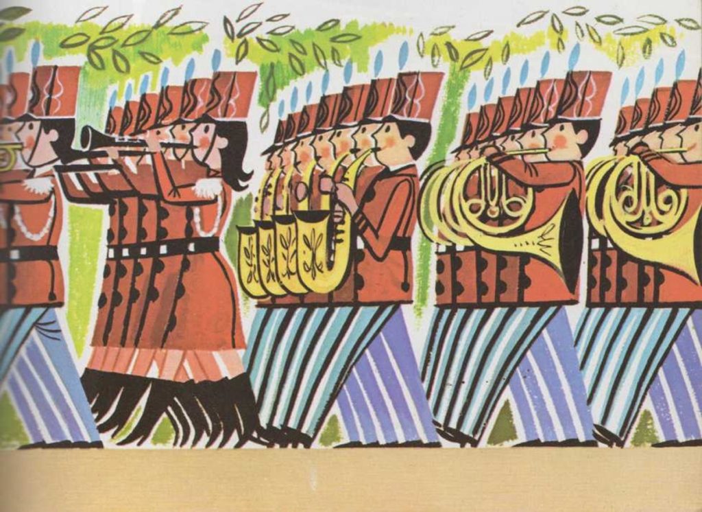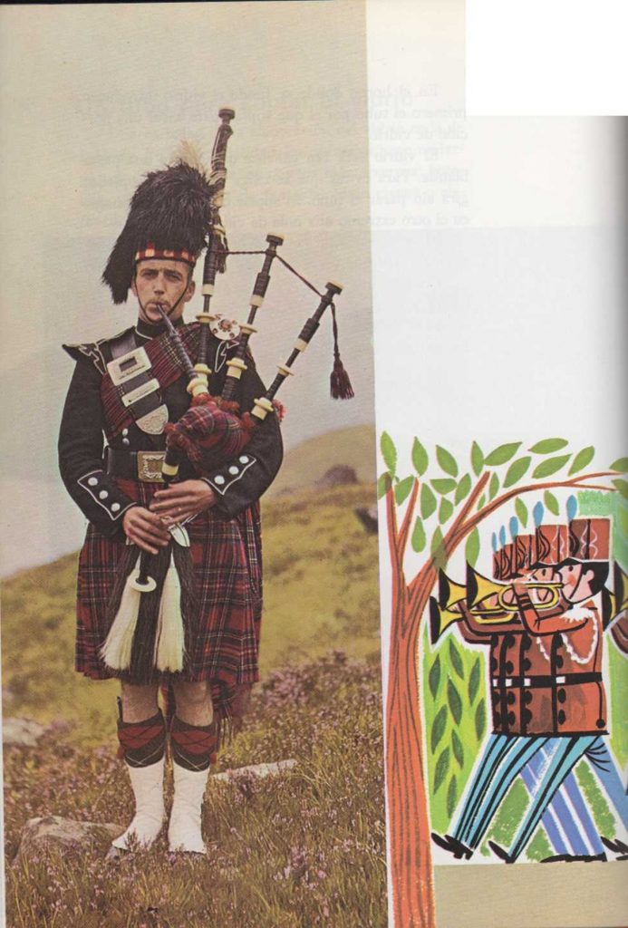 Como puedes ver en la ilustración de la página contigua, el gaitero dispone de tubos de diferente longitud para tocar su instrumento. Hay otros músicos que también se sirven de cañas y tubos. Soplan por tubos rectos, tubos curvados, tubos largos, tubos cortos, tubos gruesos, tubos delgados, tubos con agujeros y llaves, y tubos con válvulas que parecen botones. El instrumento llamado tuba está formado por un grueso y brillante tubo, plegado en forma de anillo para que el músico que lo toca pueda sostenerlo. Los que tocan el cuerno francés soplan por un tubo más curvado que el del instrumento anterior, pero más pequeño y corto. Los que tocan el trombón soplan por un largo tubo delgado y curvado. Mueven un tubo hacia adelante y hacia atrás para producir notas diferentes. Los que tocan el clarinete, el oboe y el cuerno inglés soplan por un tubo recto. Lo mismo hacen los tocadores de flauta. Los que tocan el flautín soplan por un tubo recto que sólo tiene la mitad del tamaño de la flauta.