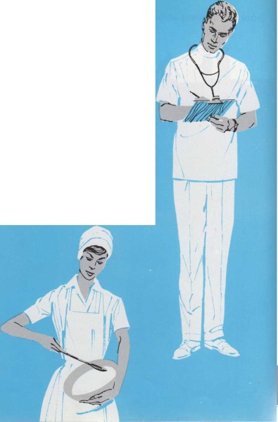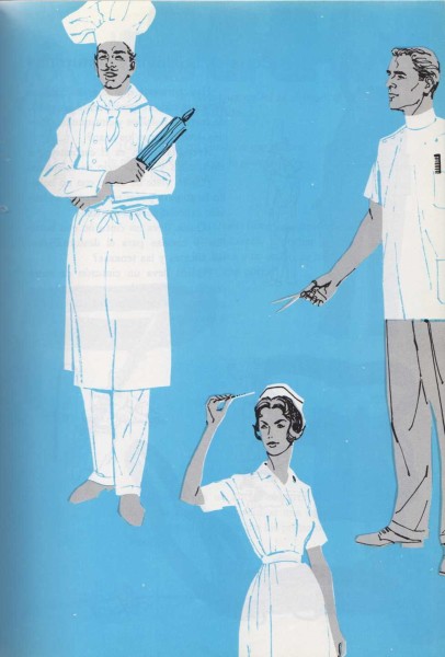Los doctores y enfermeras, los dentistas y peluqueros, llevan siempre ropa blanca cuando trabajan. Estas personas cuidan de tu salud y de tu aspecto, por eso deben ir siempre particularmente limpios. Los carniceros, panaderos, fabricantes de salchichas, los jefes de cocina de los restaurantes, el personal de la central lechera y los que hacen helados llevan vestidos blancos cuando trabajan. Estas personas preparan los alimentos que tú comes. Por esto tienen que ir siempre limpios. El blanco es un buen color para el vestido cuando hay que ir particularmente limpio en el trabajo.